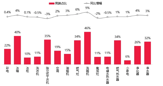 随着我国经济的稳步增长,人民生活水平日益提高,对于品质生活的要求也在提升。对于家电市场而言,用户对于品质型即高端家电的需求随之走高。奥维云网(AVC)线下监测数据显示,多数主要家电品类的高端市场份额已经占据较高的比重,部分品类的高端占比较去年同期相比有较大幅度提升。