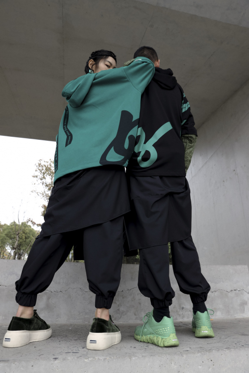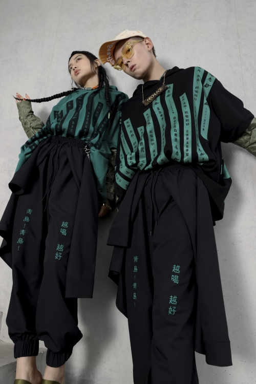 衣服整体采用时尚叠穿和不规则剪裁。袖口用杜邦纸拼接,富有层次感。袖口和裤子上分别刺绣着“青岛啤酒”logo、“青岛青岛越喝越好”国潮元素,文化底蕴和潮酷感十足。