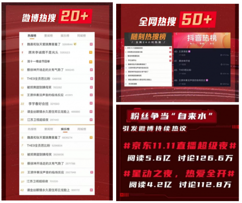 预热期,京东还陆续调动了站内包括小魔方、直播频道、校园专区等点位,以及站外公众号、媒体机构公布超级直播夜全明星阵容,配合伊利公司内部强宣传,强势积攒人气。11月10日当晚,京东APP内全量首页焦点图等购物触点资源聚力加持,引爆超级直播夜晚会高光现场,微博讨论及热搜话题一同助力直播观看人数激增。