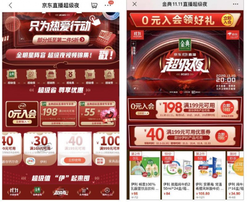 面对近年来进口牛奶对市场冲击,国民品牌伊利金典除了需要拓展更加细分垂直的产品,上新迭代,更需要以差异化传播,突围行业同质化营销局面。面对2020年的京东11.11大促,金典携手京东打造“京东11.11超级直播夜”,江苏卫视X爱奇艺X京东直播同步发声,以晚会直播+第二直播间带货的形式进行传播,让娱乐购物无缝衔接。实现线上线下媒介渠道合一,在提升品牌声量的同时,通过直播带货的形式有效促成销售转化。