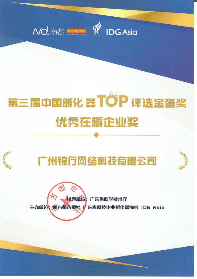 金秋九月,锦行科技除了摘得青创杯桂冠以外,还得第四届广州创投周上被评为"广州双创大赛最具投资价值奖",以及第三届"中国孵化器TOP评选"金蛋奖(优秀在孵企业奖)。