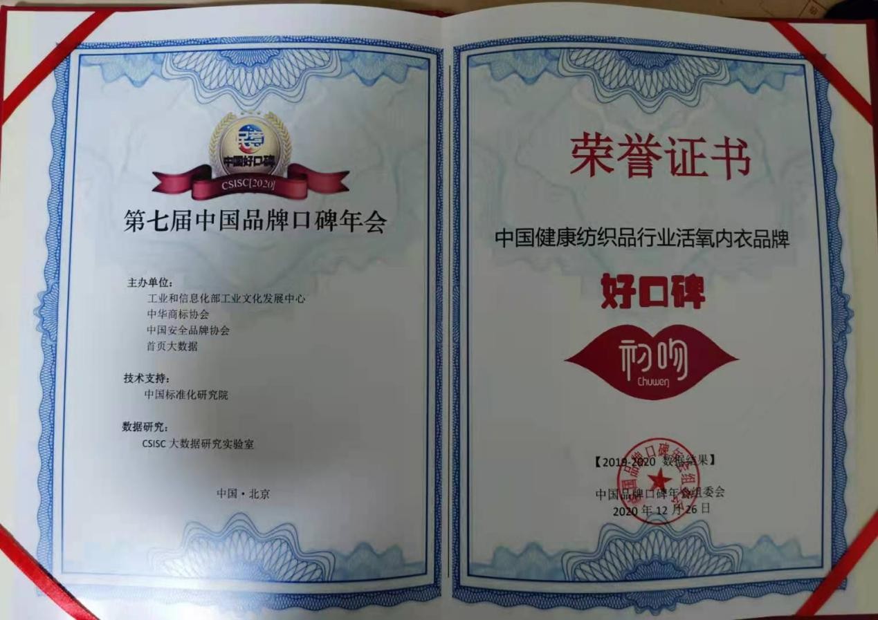 2020年12月26日,由工信部工业文化发展中心、首页大数据等机构联合发起的第七届中国品牌口碑年会在京召开,发布了2019-2020年度中国品牌口碑指数报告,年会聚焦“新基建下的数字经济品牌发展”,推出快速消费品、耐用消费品、生活服务及数字经济品牌四大类39个品类的年度中国好口碑品牌榜单,海尔智家、三元、澳柯玛、加多宝、睿至等知名品牌在列。广东其力国际贸易有限公司旗下的“初吻”品牌获得中国健康纺织品行业活氧内衣品牌“好口碑”荣誉大奖。